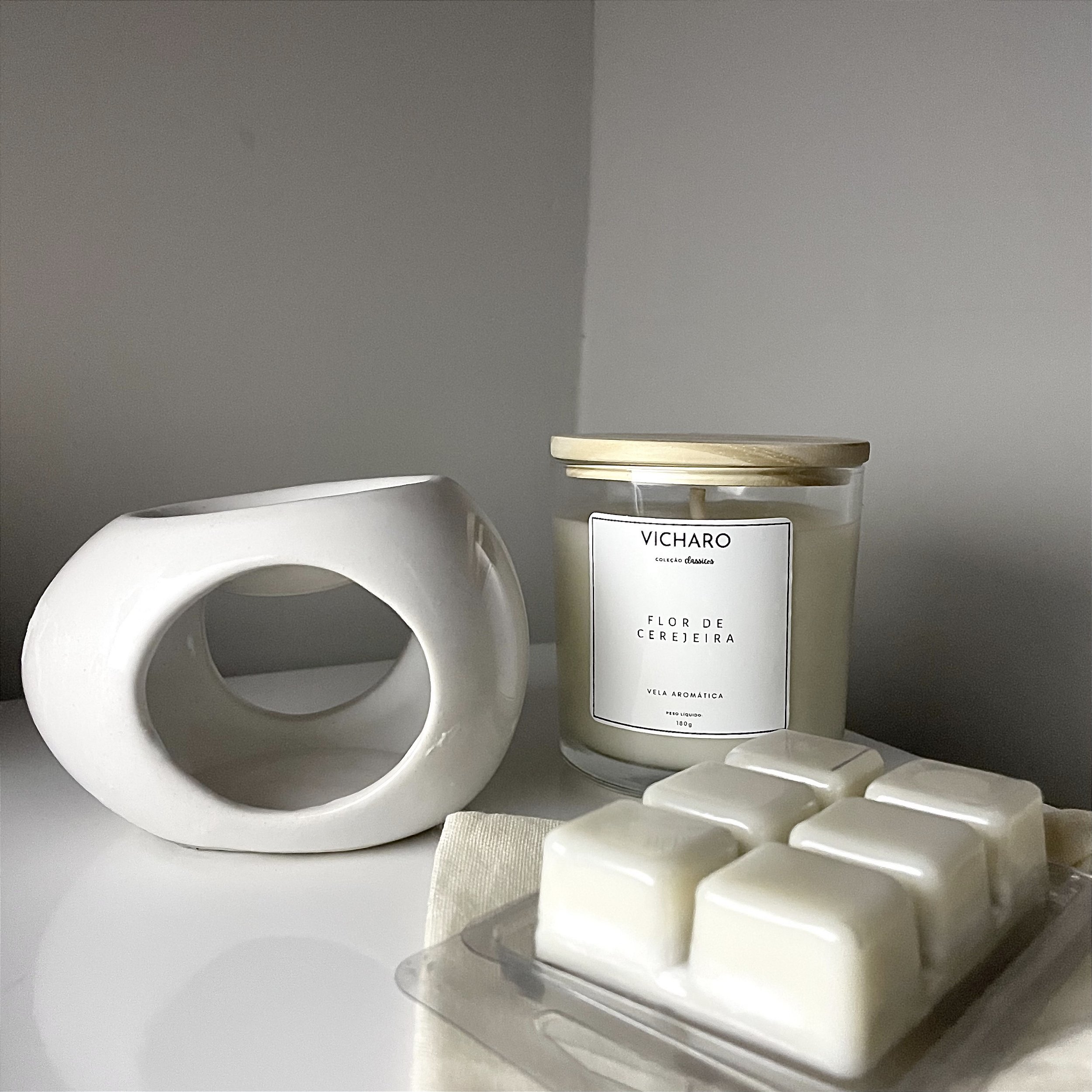 Vela Aromática (180g) — produzida com cera vegetal e fragrâncias selecionadas, proporciona luz aconchegante e aroma envolvente.